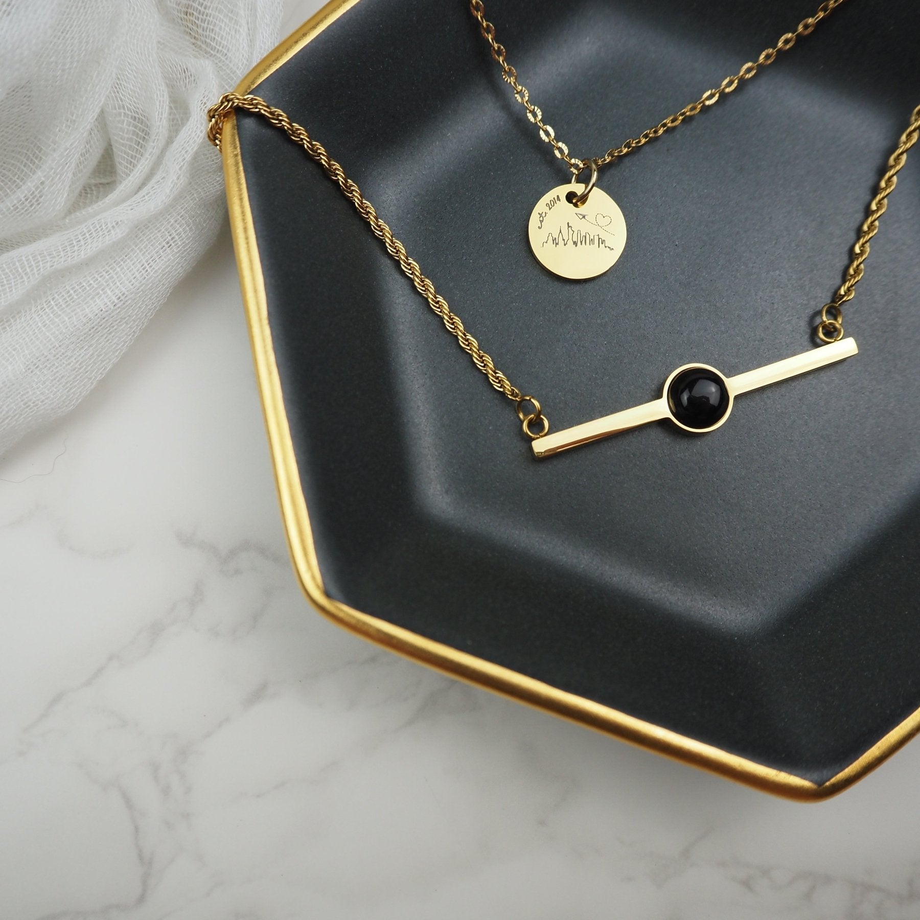 Handcrafted in Atlanta by the ever-talented Sophia Keys of Apricity Ceramics, this hexagon keepsake dish is finished in a semi-matte charcoal glaze and trimmed in hand-painted 22k gold. Each one reflects light differently, the rim catching glimmers like silk in the dark.