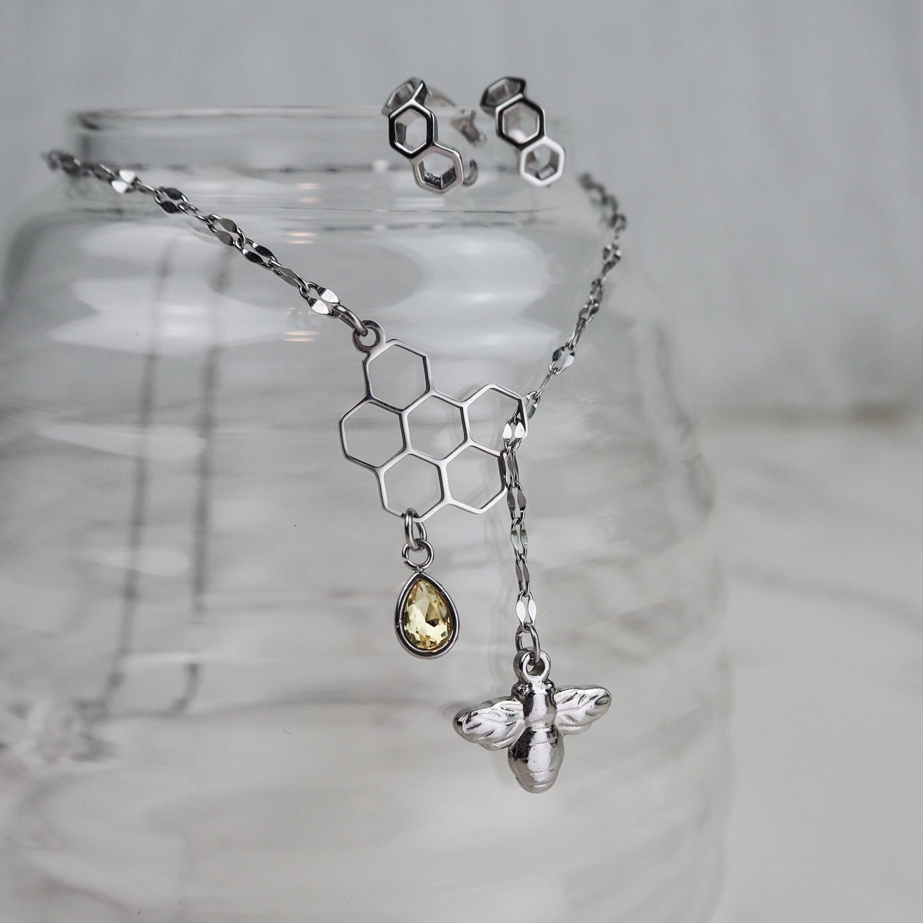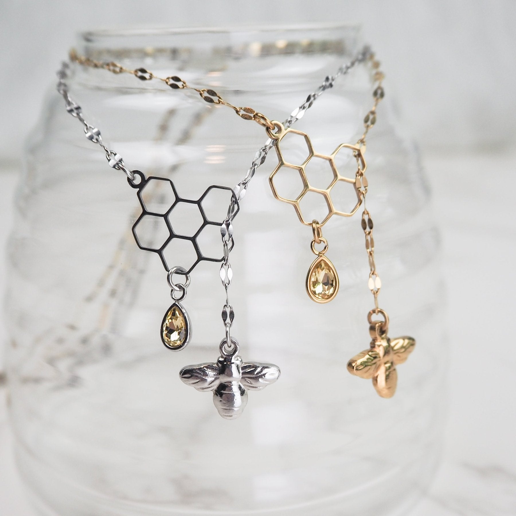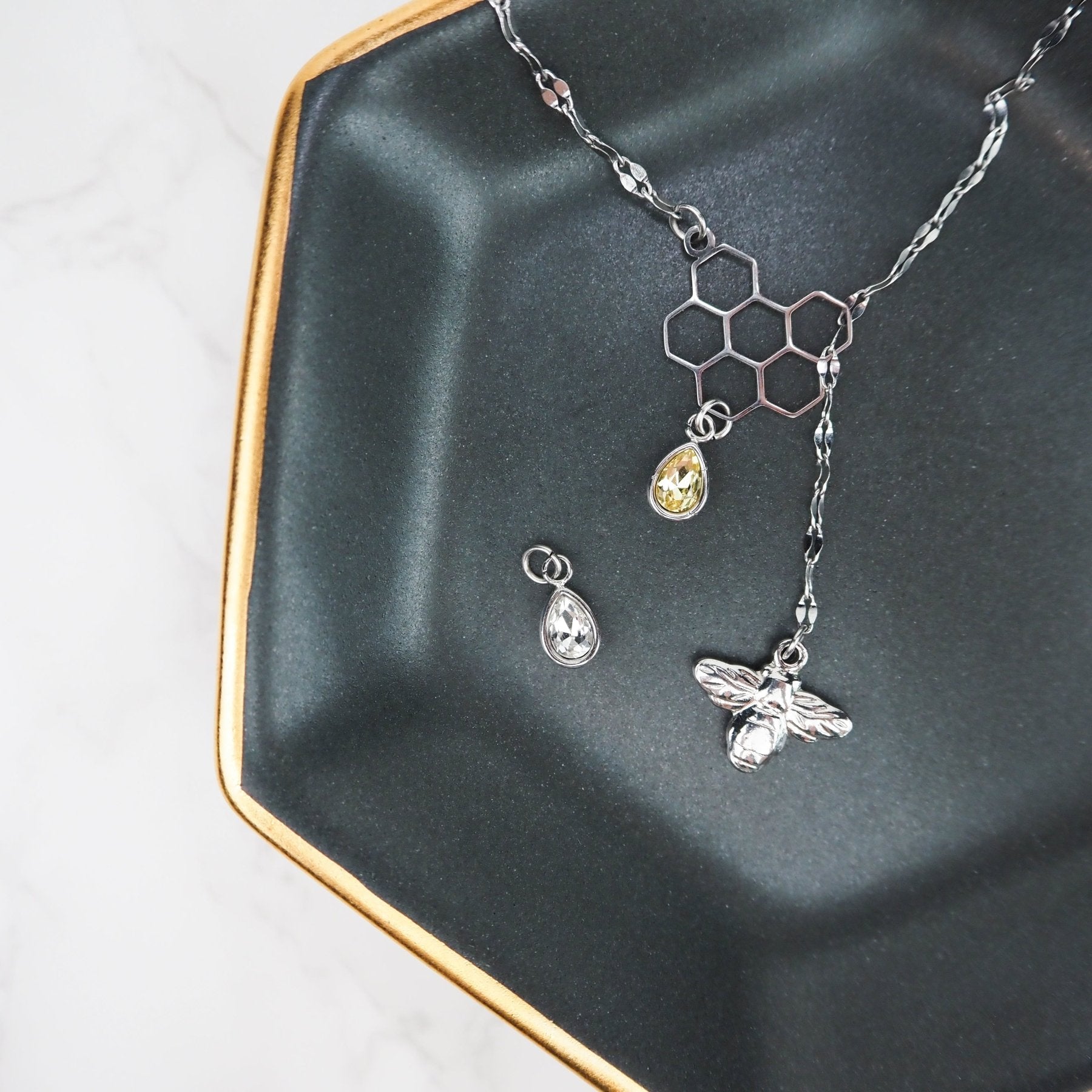 A delicate shimmer chain attached to a vintage bee charm is threaded through a hexagonal honeycomb centerpiece with a radiant drip of honey in yellow or clear. This Honeybee Lariat Necklace clasps at the back with a 2" extender, so you can anchor it exactly where you want when layering or wearing solo.