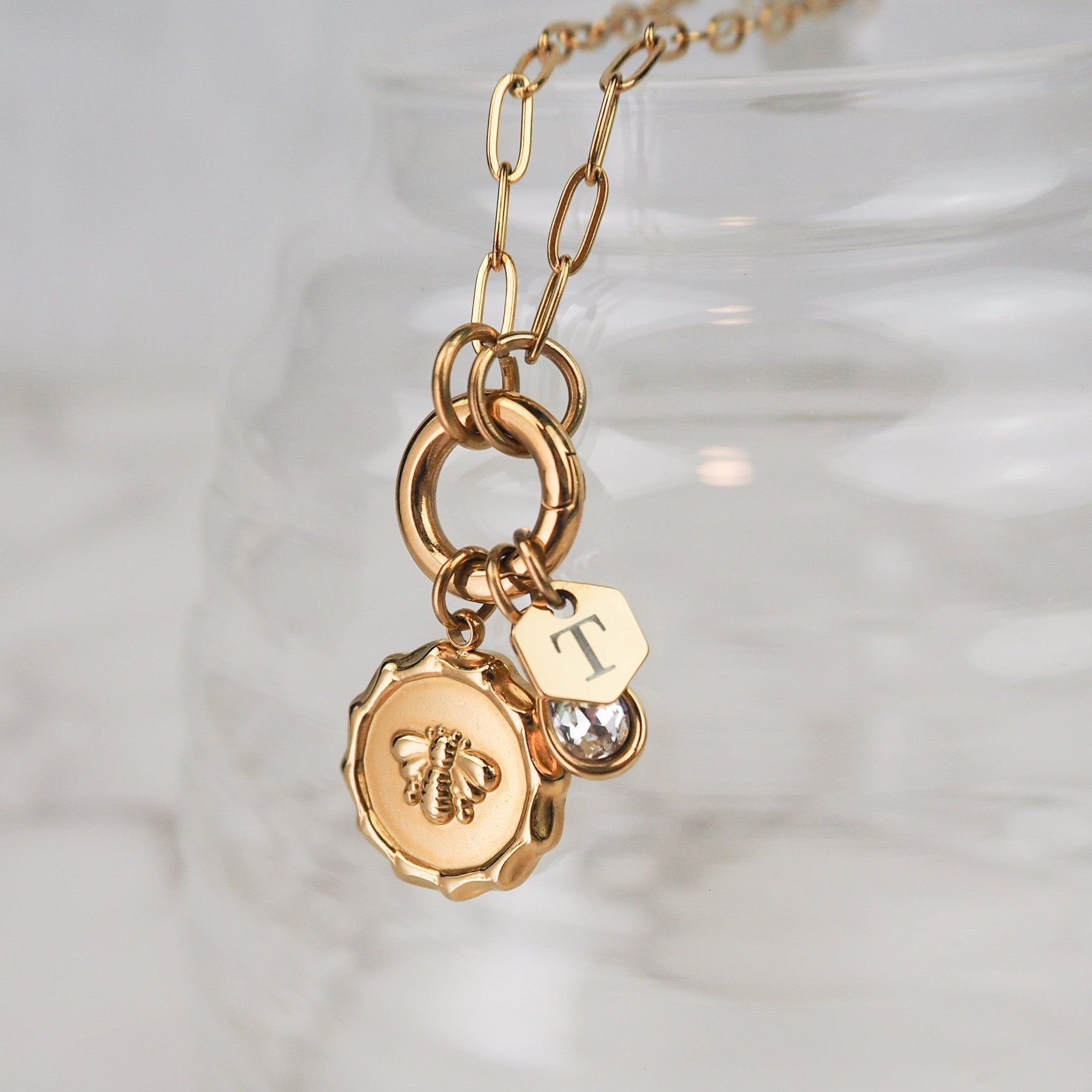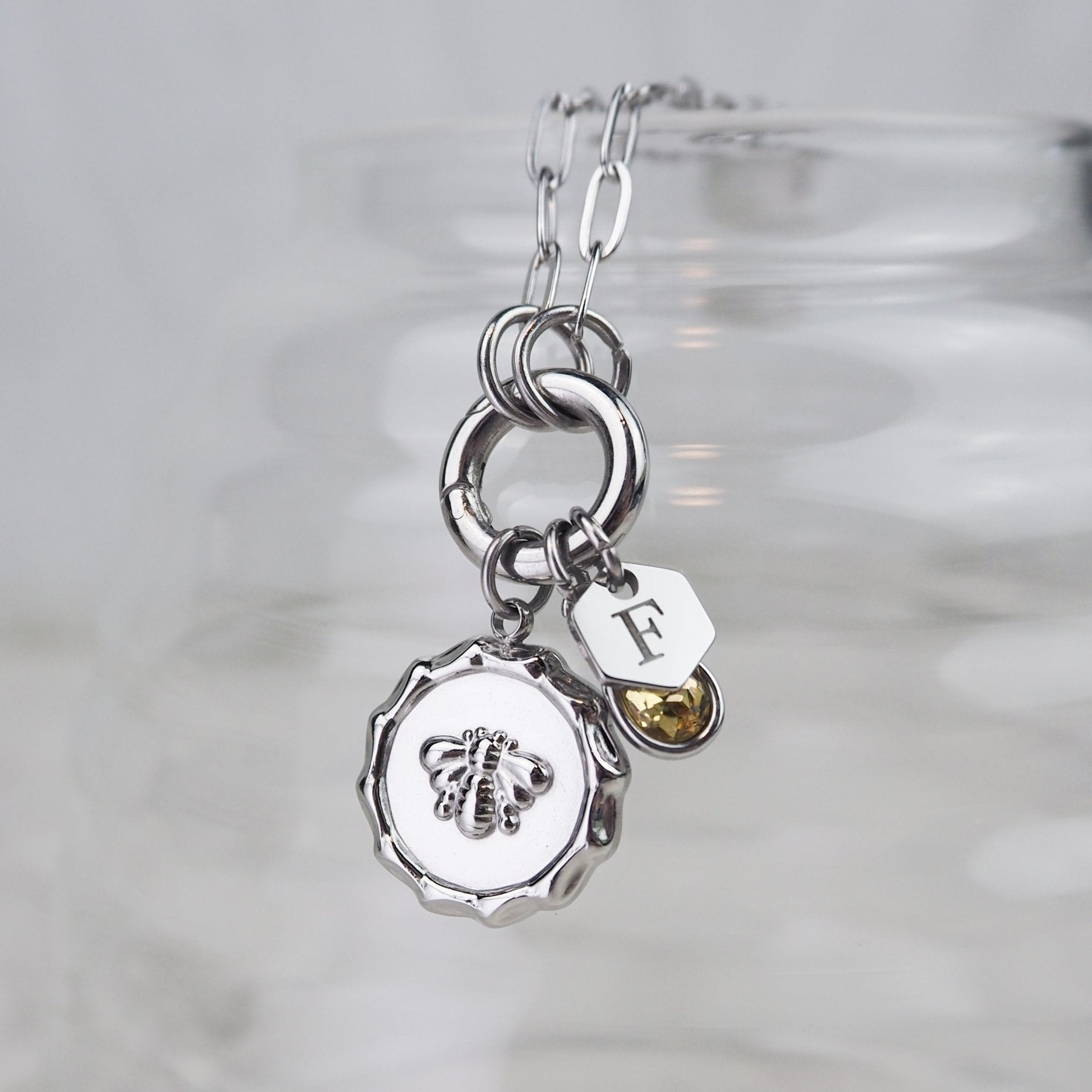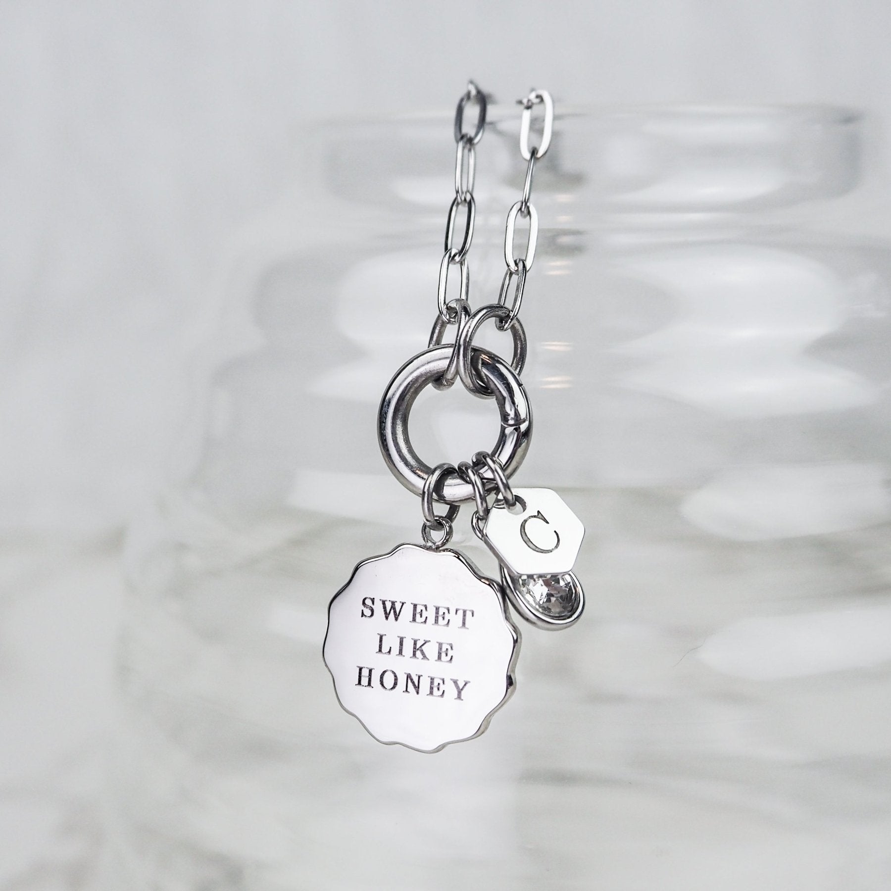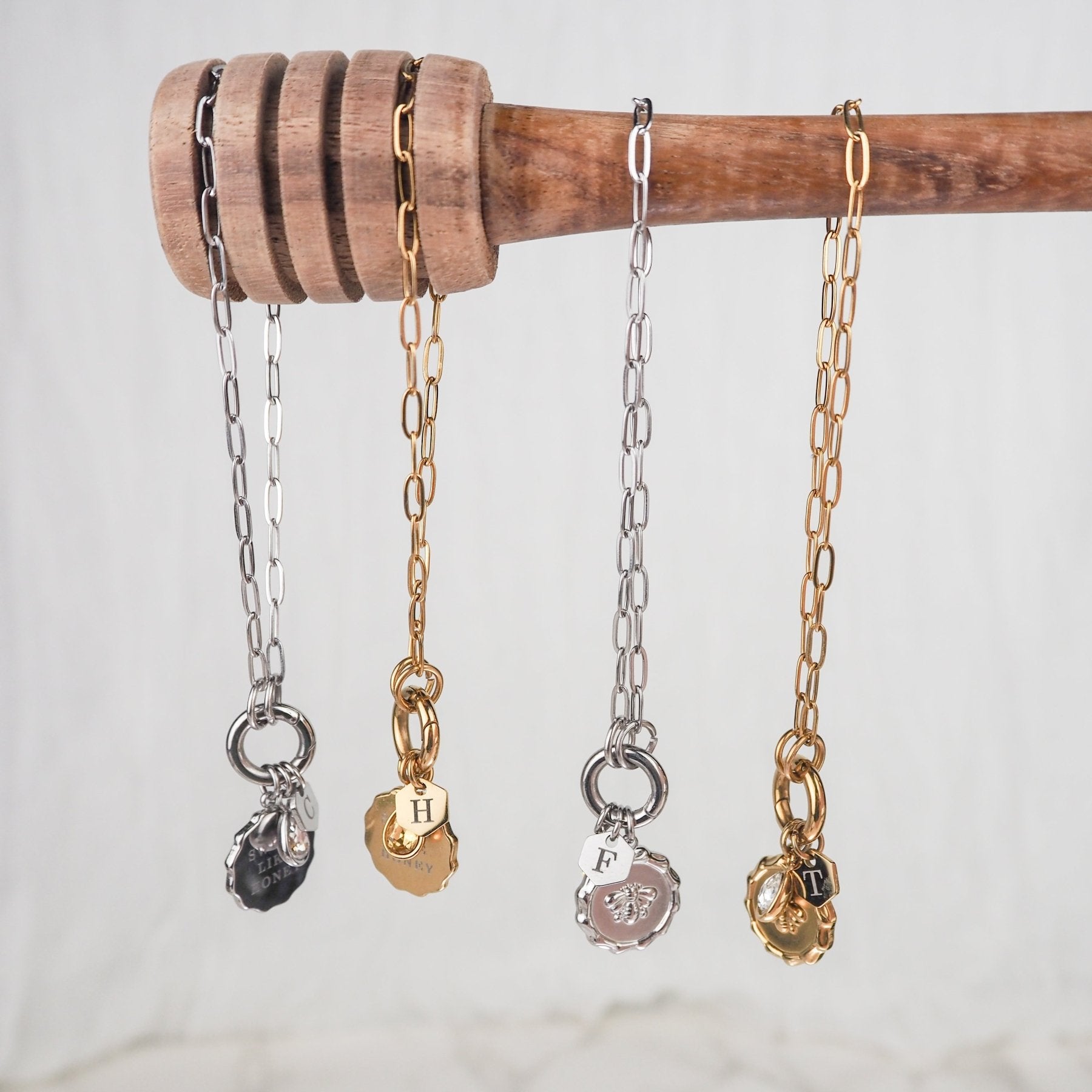 Sweet like honey and yours to define. This charm bracelet pairs a customizable hexagon, a honey droplet, and a wax seal bee, set on a paperclip chain with a carabiner clasp. Add an initial, a message, or both, and let it whisper all the sweet nothings you need to hear.