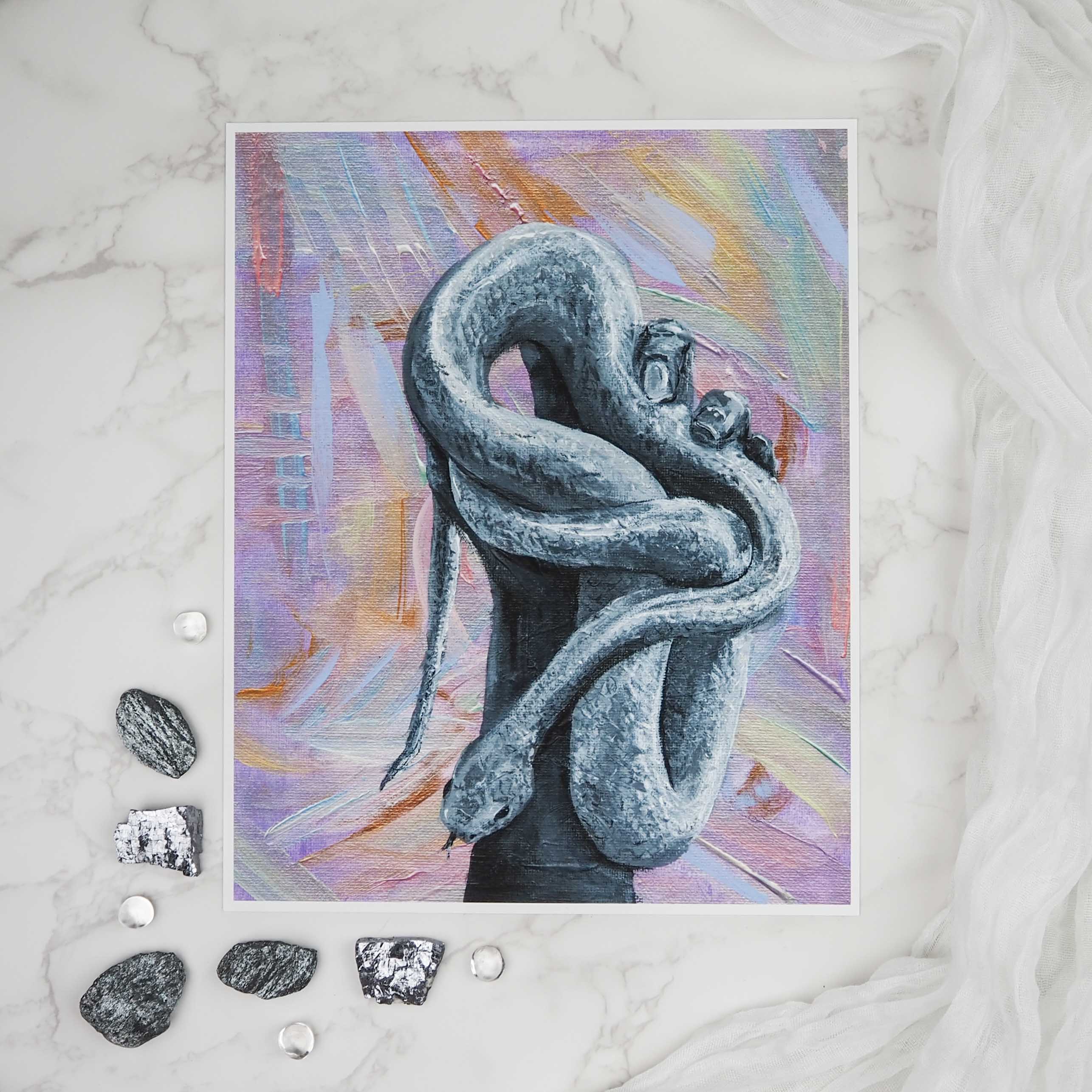 Graceful and dangerous, soft and seething. Velvet Venom captures the impossible task of holding rage in gentle hands. This piece speaks to the feminine fury we've been told to temper. A study in tension, her serpent twists like a thought too long restrained. The backdrop hums with heat, a garden of feeling too poisonous to touch.