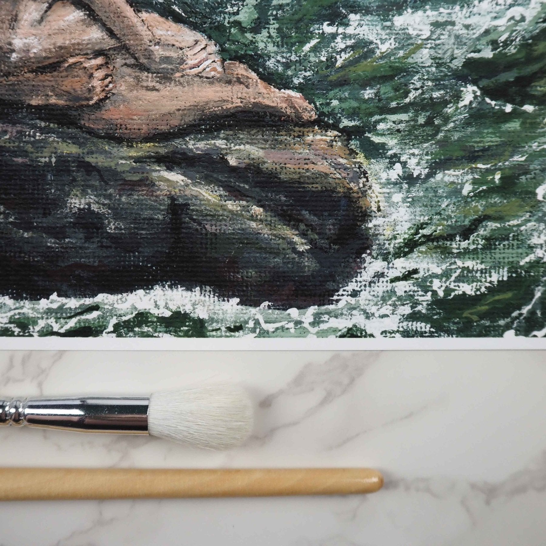 Barefoot on the last dry surface, she holds her ground as waves crash and cliffs close in. The unforgiving turbulence of deep, foamy greens mirror the sensory overload of anxiety and the quiet ache of depression.